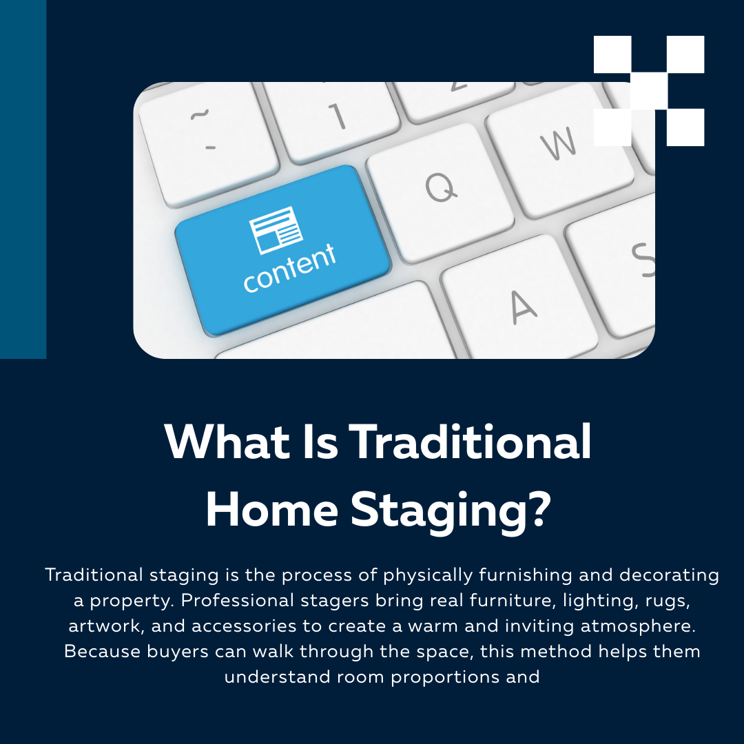 Traditional staging is the process of physically furnishing and decorating a property. Professional stagers bring real furniture, lighting, rugs, artwork, and accessories to create a warm and inviting atmosphere.